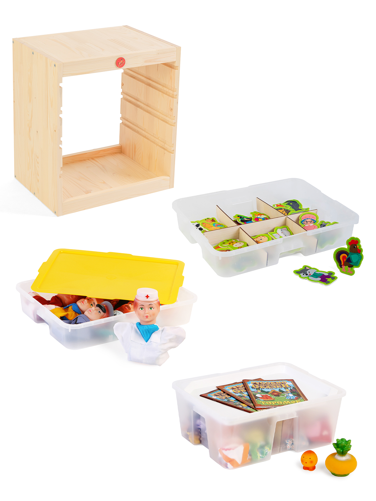 Комплектация: 8324 Игровой стеллаж 520 7219 Кукольный театр Профессии / 9 персонажей 7318 Пальчиковый кукольный театр / 6 комплектов, 30 персонажей 7217 Кукольный театр Русские сказки / 17 персонажей