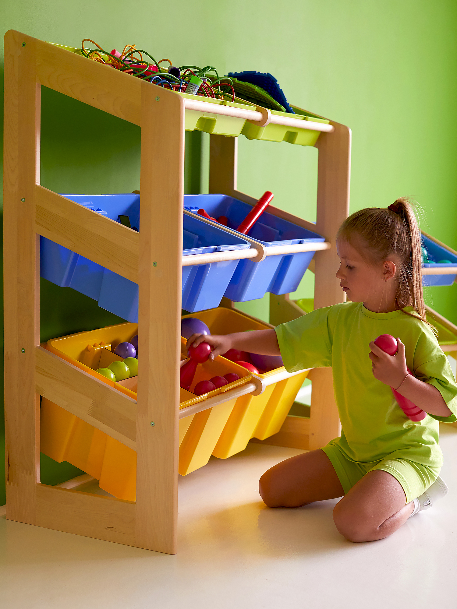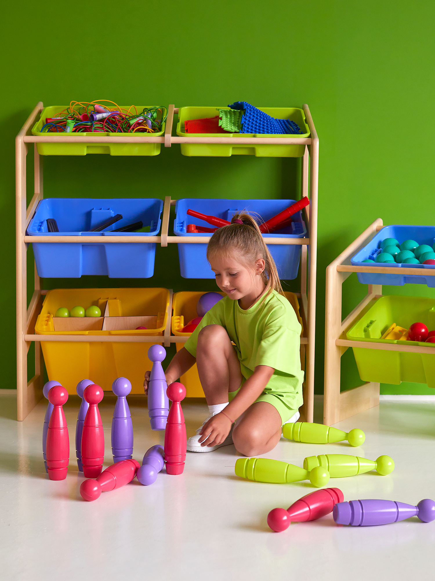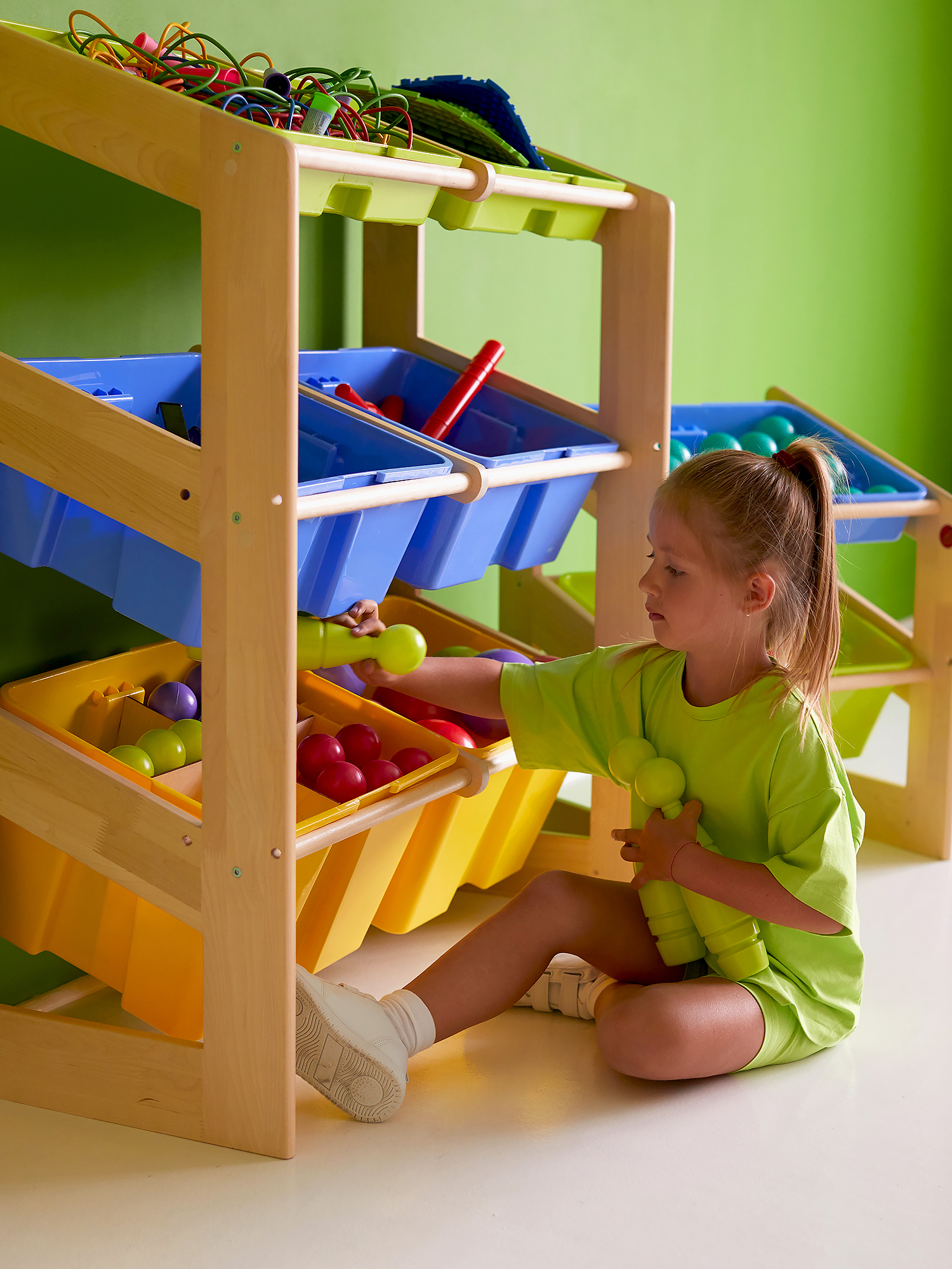 Стеллаж наклонный 1080х6 контейнеров с игровым комплектом Физкультура для детей 3-7 лет