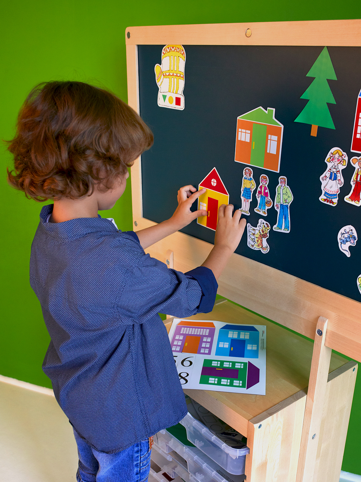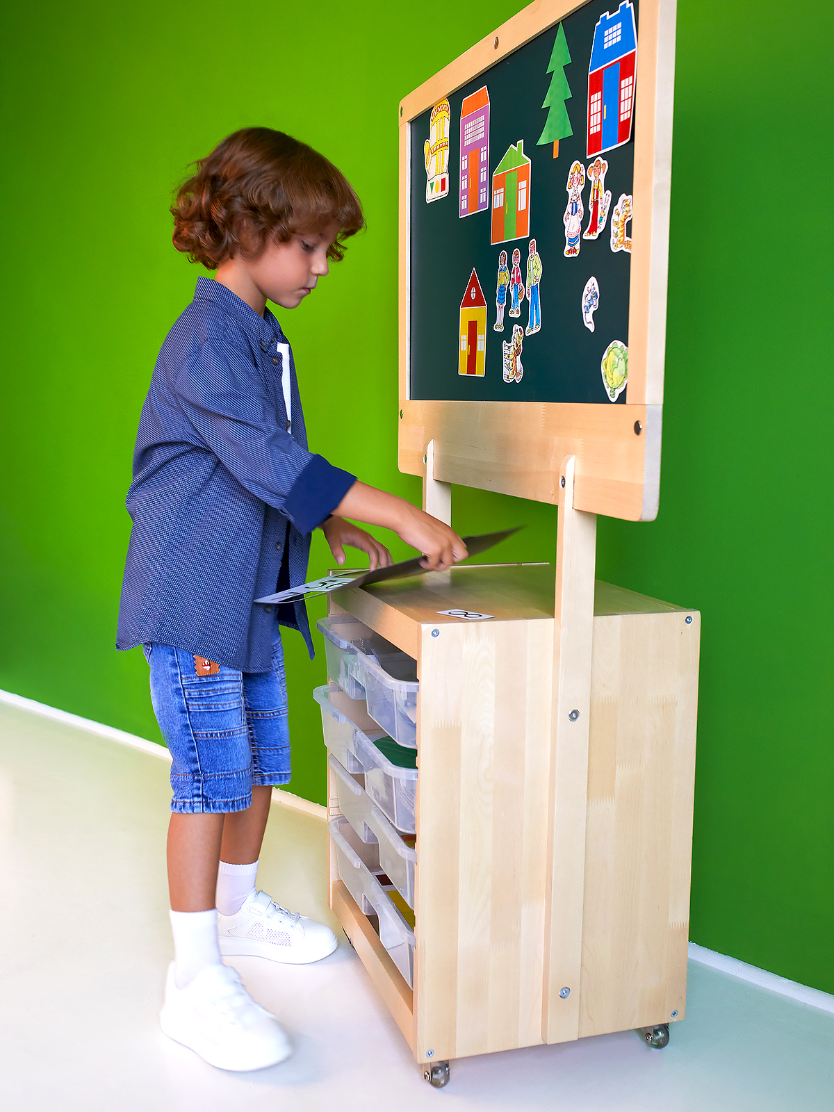 Стеллаж с магнитно-маркерной поверхностью обеспечивает размещение горизонтальных плакатов с двух сторон (с помощью магнитов), наличие контейнеров системы хранения Игротека позволяет компактно хранить необходимые дидактические материалы. Комплекс рекомендован к использованию во время групповых и индивидуальных развивающих занятий с дошкольниками всех возрастных групп. Комплектация: - мобильный стеллаж с магнитно-маркерной поверхностью - 1 шт. - контейнер № 1 – 4 шт.