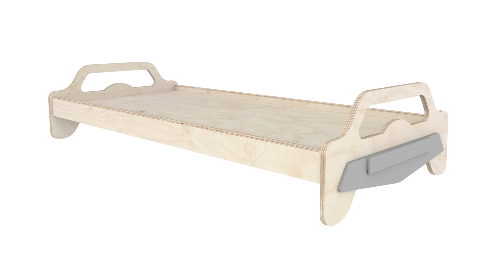 Кроватки можно штабелировать в вертикальные ряды и складировать их вдоль стен, тем самым освобождая площадь группы для различных видов деятельности. Конструкция кроватки обеспечивает чистоту спального места, а замок в вид локомотива помогает развитию воображения у детей.